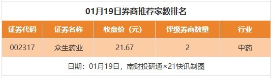 从券商推荐家数来看,1月19日有17家上市公司得到券商推荐,其中众生药业获得2家推荐,内蒙华电、外服控股等均获得1家推荐。