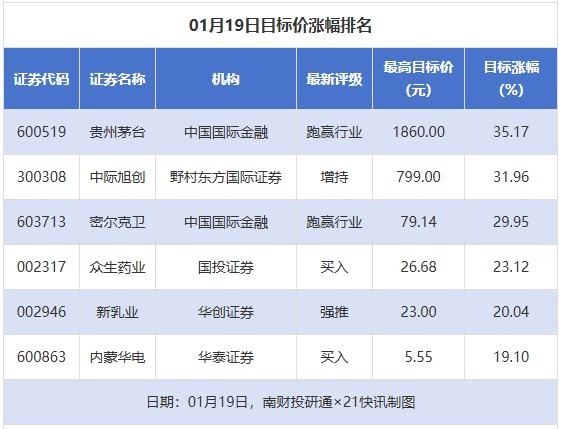 南财投研通数据显示,1月19日,券商给予上市公司目标价共6次,按最新收盘价计算,目标价涨幅排名居前的公司有贵州茅台、中际旭创、密尔克卫,目标价涨幅分别为35.17%、31.96%、29.95%,分别属于白酒、通信设备、物流行业。