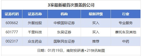 首次覆盖方面,1月19日券商共给出了3次首次覆盖,其中外服控股获得中银国际证券给予“买入”评级,千里科技获得东吴证券给予“买入”评级,众生药业获得国联民生证券给予“推荐”评级。