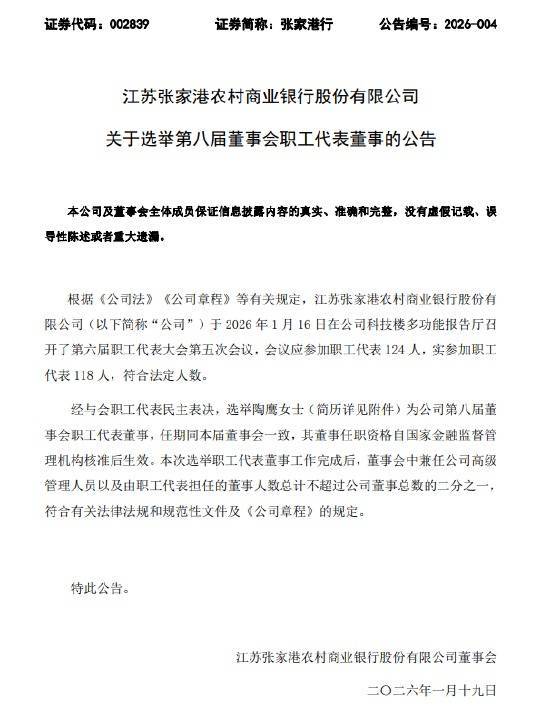 1月19日,张家港行发布公告,公司于2026年1月16日召开职工代表大会会议,选举陶鹰为董事会职工代表董事,任期同本届董事会一致。