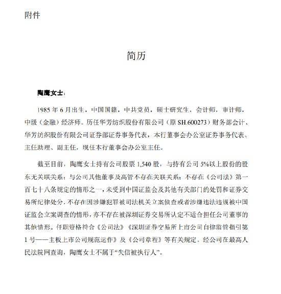 简历信息显示,陶鹰,1985年6月出生,曾任华芳纺织财务部会计、证券部证券事务代表,张家港行董事会办公室证券事务代表、主任助理、副主任,现任张家港行董事会办公室主任。
